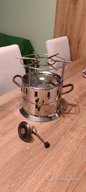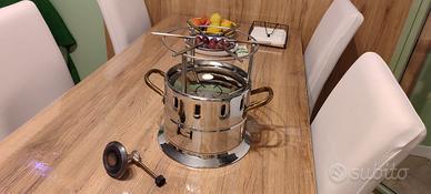 Vendo fornello in acciaio per cucina flambé, con maniglie ottonate. Nuovo, usato solo 3 volte. Nelle foto si vedono gli elementi che lo compongono : griglia, spargifiamme, coperchio, alzata per bombola del gas.
