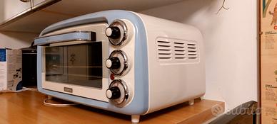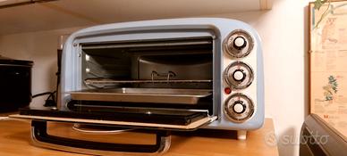 Fornetto elettrico vintage in colore avorio con dettagli azzurri dotato di griglia, teglia e pinza, in ottimo stato, usato pochissimo. Larghezza 47 cm Profondità (dalle manopole al muro cm 40 circa) Altezza 24 cm Marca Ariete