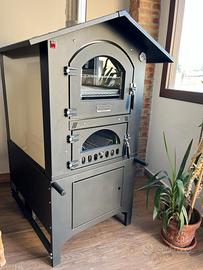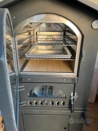 Forno a combustione indiretta. Fornito di piastra refrattaria certificata per usi alimentari, il forno e ideale per la cottura di pane, pizza, arrosti e qualsiasi altro piatto. Provvisto di sistema di ventilazione interna a 12 Volt e pratica illuminazione. Fornito con un pratico carrello per il piu ampio spostamento, canna fumaria con cappello anti-pioggia, due griglie, un padellone di cottura e termometro. Completano la dotazione due robuste porte in ghisa, sia per il focolare di combustione che per la camera di cottura, con un ampio vetro per l'ispezione del fuoco e dei cibi in cottura.