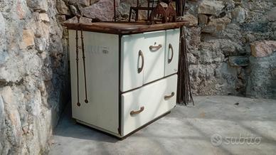 simpatica cucina - stufa - forno a legna anni 40, laccata bianca, piano in ghisa