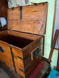 Splendido forziere d’epoca in legno massello, rifinito con robuste staffe e cerniere in ferro battuto. Il pezzo presenta una serratura centrale originale con chiave, che ne esalta il fascino autentico e lo rende perfetto sia come elemento decorativo sia come contenitore funzionale. Ottimo come baule contenitore, tavolino o complemento d’arredo rustico