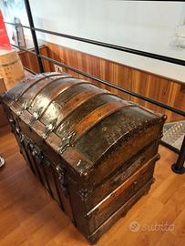 Elegante forziere in legno con fasciame bronzato. Usato per fare le scenografie in esposizione. L'interno è rivestito con tessuto vellutato rosso come nuovo appena rifatto.