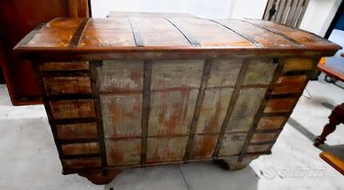 Forziere indiano del XIX secolo, rilegato in legno e metallo su ruote, talvolta indicato come cassa della dote o cassa del mercante. Copertura ad arco e maniglie laterali per il trasporto, ruote in legno funzionanti. Presenza di un sottofondo. Frontale del forziere con due cassettini che danno nel sottofondo e che a loro volta presentano altri comparti segreti, a cui si accede tirando un chiodo, piegato a metà che funge da pomello. Anche nel fondo del baule sono presenti altre tre aperture, che danno nel sottofondo e che non sono a vista e ci si accede sempre tirando un chiodo quale pomello. A loro volta, ogni apertura, presenta altrettanti scomparti segreti, apribili sempre con chiodi per pomello ma questa volta agendo anche su un piccolo cuneo di ferro. Gran belle soluzioni per poter celare oggetti vari. Da restaurare. Dimensioni: H 99 - L 142 - P 78.