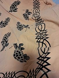 foulard diano o letto in cotone con fantasia tartarughe in colore nero e fondo giallo arancio misura 210x235 cm nel lato più corto ci sono delle piccole frangie .sempre in cotone.