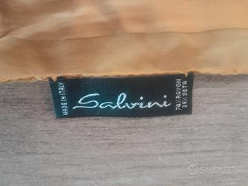 Foulard Salvini Gioielli (Gruppo Damiani) Originale – Seta e Rayon – Color Tabacco/Oro – Nuovo Accessorio raffinato, realizzato con un pregiato misto di seta e rayon, è un'autentica dichiarazione di stile. Il colore tabacco, con i suoi riflessi dorati, è caldo, avvolgente e incredibilmente versatile, perfetto per completare look sia formali che casual. Originalità Garantita: Un accessorio autentico firmato Salvini Gioielli, un marchio sinonimo di lusso e qualità. Materiale Pregiato: Realizzato in un morbido e fluente misto di 74% Rayon e 26% Seta. La seta dona lucentezza e morbidezza, mentre il rayon conferisce drappeggio e resistenza. Colore Sofisticato: Un'elegante tonalità tabacco/oro che cattura la luce, aggiungendo un tocco di calore e luminosità. Dimensioni Generose: Con i suoi 175 cm x 68 cm, è un foulard ampio e versatile che può essere indossato in molteplici modi: drappeggiato intorno al collo, come stola, o anche come accessorio per la borsa. Dettagli Raffinati: La scritta "Salvini" è elegantemente tessuta lungo il bordo, aggiungendo un tocco discreto ma distintivo. Made in Italy: Un prodotto di eccellenza, interamente realizzato in Italia con la cura e l'attenzione ai dettagli tipiche del design italiano. Un pezzo unico per chi apprezza il lusso e la qualità dei materiali!