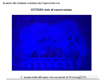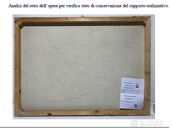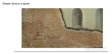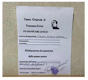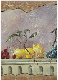 Composizione di frutta - cm. 64X88 - anno 2009 Questa composizione di natura morta è un’opera a firma di Francesco Errico, artista attivo nel panorama italiano contemporaneo, noto per la sua capacità di fondere tecniche antiche con una sensibilità pittorica sobria e misurata. L’opera qui proposta rappresenta una raccolta di frutti – ciliegie, limoni e uva – disposti su una balaustra architettonica che richiama l’estetica classica, con un sapiente uso del chiaroscuro e una tavolozza calda e armoniosa. Il fondo violetto e la cornice irregolare simulano lo “strappo” tipico dello stacco da muro, con l’intento di conferire alla scena un effetto di affresco riemergente dal tempo, evocando la pittura pompeiana e la decorazione parietale rinascimentale. La firma “Errico” in basso a sinistra è confermata da certificato di autenticità con impronta digitale e firma manoscritta dell’autore, che riporta anche la tecnica usata e l'anno di realizzazione (2009). Francesco Errico si colloca tra gli artisti italiani che propongono un recupero della tradizione pittorica attraverso tecniche storiche. Artista autodidatta, Francesco Errico nasce a Padova nell’estate 1978. Sin da giovane mostra un forte interesse per la forma e la prospettiva, con lo studio iniziale di carboncino e tecniche di sfumatura. Successivamente si avvicina al materico, sperimentando l'uso di gesso e supporti materici come base di pittura. Intorno al 2010 sviluppa un linguaggio visivo personale incentrato su oggetti iconici. Tra le sue mostre personali più significative si ricordano l'esposizione del 2012 presso la Galleria Rinascente di Padova, dove ha presentato una serie di opere su supporti materici, e la personale del 2022 allestita negli spazi sotterranei di Palazzo Santo Stefano, sempre a Padova, un contesto suggestivo che ha valorizzato il carattere evocativo delle sue composizioni. Nel 2023 è stato selezionato come finalista all’Arte Laguna Prize, importante premio internazionale con sede a Venezia.