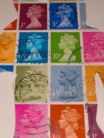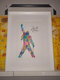 Quadro con sagoma del leader dei Queen, Freddie Mercury, intagliata su carta di lino con tramatura telata certificata FSC, su veri francobolli inglesi raffiguranti la regina Elisabetta II.