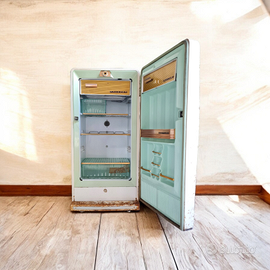 Frigorifero Yuman degli anni 50 che incarna perfettamente lo stile e il gusto dell'Italia del dopoguerra: linee morbide, color crema, maniglie cromate e interni verde acqua con inserti dorati, finiture che gli donano un grande fascino.