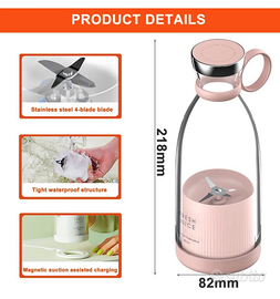 Frullatore Smoothie Fresh Juice, Mini Frullatore Portatile, Personale per Blender Bottle Portatile, via con Ricarica USB e wireless, Smoothie Maker da 350 ml, per Viaggi, Ufficio, Palestra, Rosa