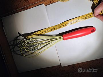 Frusta da cucina con manico rosso e fili gialli. 2 in 1 - Manico in plastica. - Fili in metallo. Con rompigrumi