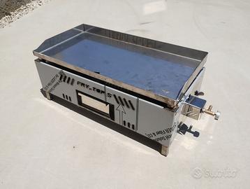 Piastra da cottura in Acciaio Inox, con bruciatore ad alimentazione a gas, tipologia Fry-Top, interamente realizzata in acciaio inox, dimensione utile cottura cm. 60x30, con piano cottura in lamiera spessore 3 mm.