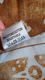 Fulard Jacob Cohen, Seta 30% e Cotone 70%.. Le dimensioni 54,5x54,5 cm. La stampa/decorazione sul tessuto rappresenta il sole, il colore è beige e bianco. L'orlo lungo il perimetro è cucito a mano.