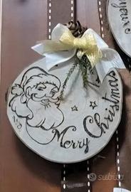 Fuori porta natalizio artigianale, realizzato con materiali naturali . Fiocco grande principale in juta con sovrapposizione di altri fiocchi di vari materiali, rametti di legno, pigne ,mini melograni,pino e fette di tronco inciso con pirografo. Adatto anche da regalare
