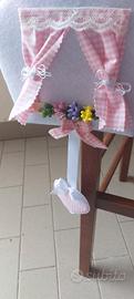 un simpaticissimo fuori porta oppure usato come fiocco nascita fatto interamente a mano in pannolenci e tessuto leggermente imbottito e morbido , misura 43 cm fino al cuore finale e 21 cm di larghezza