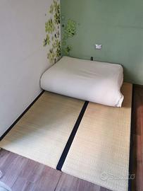 Futon linn-sui 120x200x17 cm (comodissimo come singolo, ma si sta comodi anche in due) in cotone, sempre arieggiato e girato periodicamente, con fodera aggiuntiva lavabile.