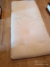 Futon in puro cotone marca Woodly, utilizzato da mia figlia per 5 anni, ormai grande. utilizzato Sempre con coprimaterasso impermeabile ma traspirante, vendibile separatamente a 20€ se interessati, misure letto Montessori 70×160.