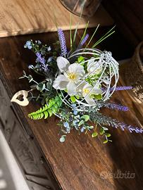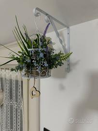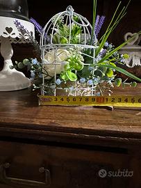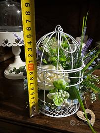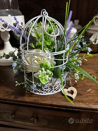 Gabbietta in ferro con composizione floreale artificiali con colazione verde panna lavanda e azzurro Pezzo unico