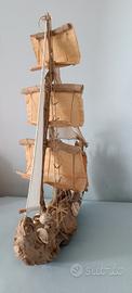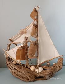 Manufatto artistico realizzato con legno di mare (sanificato e trattato), conchiglie di pregio, vele in cotone cucite su misura, funi e torretta in spago naturale, àncora in legno sempre di recupero, timone a chiocciola.