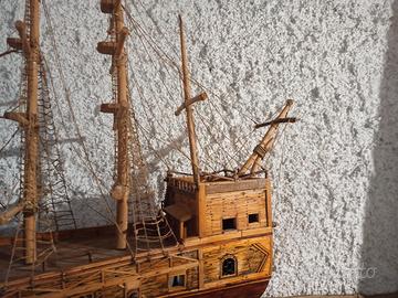 Galeone spagnolo artigianale, fatto con fiammiferi incollati l'uno all'altro. Arredato all'interno. Completo di piedistallo in legno. Misure 60 cm x 60 cm circa. Solo ritiro a mano.