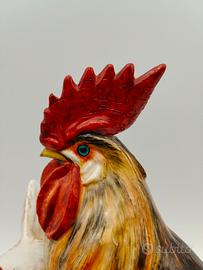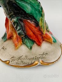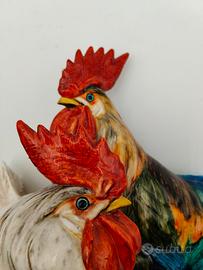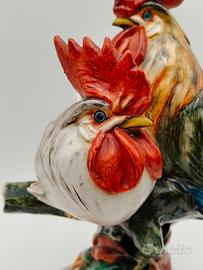 Coppia di galli su tronco di quercia, Anni Cinquanta Firma G. Cacciapuoti in pasta sul retro della base e sotto; la prima firma accompagnata da timbro incusso Made in Italy.Le ceramiche di Cacciapuoti, ed in particolare quelle dedicate agli animali, sono presenti in vari musei italiani ed internazionaliper le loro qualità artistiche.Molte ceramiche sono inserite in pubblicazioni dedicate alla scultura e alla ceramica del 900 italiano, insieme alle opere di Lenci, Giò Ponti, Vacchetti, Rometti, Melandri, Zaccagnini.La ceramica "coppia di galli" è stata esposta alla mostra di Milano nel 2008 (Cacciapuoti e l'arte Animalier, Ceramiche da collezione). ceramica policroma cm 38x29x13 Bibliografia: Si vedano le pagine dedicate maestro Cacciapuoti in: Enciclopedia Treccani; Il Dizionario degli Scultori italiani del 900 (Allemandi), Per virtù del fuoco; Novecento Ceramiche Italiane (Faenza editoriale); 900-novecentogradi (ETS); Mostra della Ceramica Italiana 1920-40 (Torino); Le Ceramiche Cacciapuoti (Editoriale Olimpia