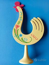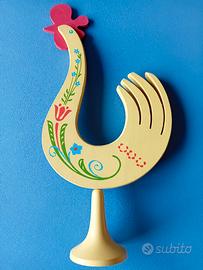 Gallo in legno dipinto a mano, di artigianato svedese. Dipinto con fiori di diversi colori su sfondo giallo e cresta del gallo di colore rosso. Il gallo è poggiato su uno stelo con base circolare. Dimensioni altezza 30 cm. Ottime condizioni generali.
