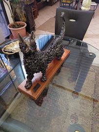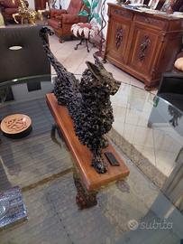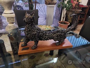 Scultura di Gatto "Bassotto "allungato realizzato in scarti di tondini di acciao e ferro saldati tra loro e tagliato a cannello. Lunghezza 80 cm e altezza 38 cm.esso.poggia su di una base in legno di noce. Pezzo unico e da collezione.