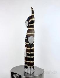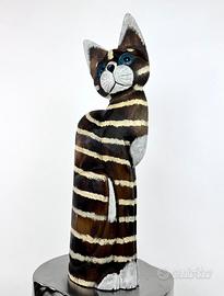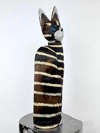 Splendido Gatto Scultura realizzato in solido legno e interamente dipinto a mano. Un vero e proprio pezzo unico d'artigianato, caratterizzato da un design slanciato, moderno ed elegante. La finitura a strisce orizzontali bianche su base scura crea un contrasto cromatico unico e di grande impatto visivo. L'espressività degli occhi azzurri è particolarmente curata e affascinante. Questo gatto è l'elemento d'arredo perfetto per dare un tocco esotico, rustico e artistico a qualsiasi ambiente. Oggetto in perfette condizioni, pronto per abbellire la tua casa.