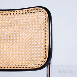 Presentiamo un raffinato set di quattro sedie “Cesca”, uno dei capolavori assoluti del design moderno. Disegnate nel 1928 da Marcel Breuer, rappresentano la sintesi perfetta tra il linguaggio razionalista del Bauhaus e l’innovazione strutturale della seduta a sbalzo (cantilever), che ha rivoluzionato il concetto di leggerezza nell’arredo. La produzione firmata Gavina, realizzata alla fine degli anni ’60, è oggi tra le più ricercate dai collezionisti per l’elevata qualità esecutiva e la fedeltà al progetto originale. Dimensioni Altezza: 80 cm Larghezza: 46 cm Profondità: 48 cm Altezza seduta: 46 cm Dettagli di autenticità e rarità Questo set si distingue per elementi costruttivi e storici di grande interesse collezionistico: la presenza di tracce originali di impagliatura a mano sui telai in legno testimonia le tecniche artigianali d’origine, precedenti alla diffusione dei materiali pre-tessuti. Sotto le sedute sono ancora presenti le etichette originali Gavina, ulteriore conferma della provenienza e dell’epoca di produzione. I terminali dei tubolari in acciaio risultano chiusi integralmente, dettaglio tecnico distintivo delle prime produzioni, oggi molto ricercato. Condizioni del lotto: restauro conservativo professionale Il set è stato sottoposto a un accurato intervento di restauro volto a preservarne l’autenticità e garantirne la piena funzionalità. Il tubolare cromato è solido e integro, con lucidatura professionale che ne ha ripristinato la brillantezza, mantenendo lievi segni del tempo coerenti con la storia del pezzo. I telai in faggio laccato nero sono stati restaurati e si presentano in eccellenti condizioni strutturali ed estetiche. La paglia di Vienna è stata sostituita professionalmente su tutte le sedute, rispettando fedelmente tensione e resa estetica originali. Un set iconico, pronto per essere inserito in contesti contemporanei o collezioni di alto profilo.