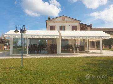 Gazebo modello QZebo Giulio Barbieri, la struttura è composta da quatto moduli da 5 m x 5 m, costituendo un unico blocco da 10 m x 10 m con una superficie calpestabile di 100 m2, munito di vetrate scorrevoli sui quattro lati, tende motorizzate interne e su due lati esterni sono installate tende parasole.