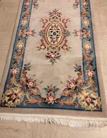 -Grazioso tappeto cinese, medio grande, stimato con foto, con rosone centrale, su fondo rosa salmone e bordure celesti. -Può trovare qualunque collocazione sia per le sue misure che per la sua robustezza. -Annodato a mano, risalente alla seconda meta' del XX sec., 182 x 92 cm, rosone centrale e lati decorati a motivi floreali. -Manufatto morbido al tatto, lana di ottima qualità che conferisce al tappeto singolare brillantezza e piacere, vello soffice, spessore e robustezza. -Nessuna riparazione, nessun foro. Piccola irregolarità in un angolo evidenziata in foto. -Non sanificato professionalmente ma corsevato in modo impeccabile. Per ulteriori informazioni, prima e nn dopo l'acquisto. Spedizione privata 25 euro da aggiungere.