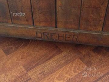 Antica ghiacciaia della ditta Dreher in legno originale con scritta .Erano contenitori che venivano forniti per raffreddare le bibite co aggiunta di gelo rivestita in lamiera co rubinetto per togliere l'acqua all'interno .Ottimo stato