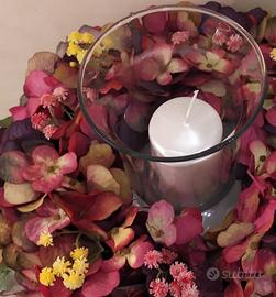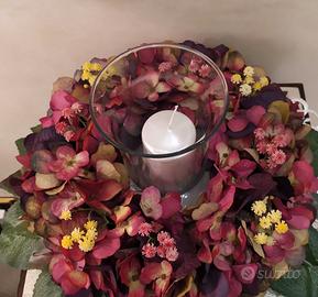 Ghirlanda centro tavola realizzata con ortensie artificiali nei toni del bordeaux. Indicata come elegante idea regalo, per valorizzare vari tipi di arredamento, o la mis-en-place della tavola per cene o pranzi raffinati e a lume di candela.