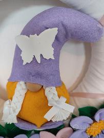 ghirlanda fuoriporta bianca decorata con gnoma gialla e lilla, con fiori in pannolenci lilla e rosa e con scritta "Home sweet Home". Diametro 25 cm.