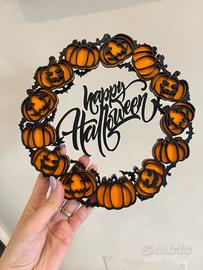 Decorazione realizzata in PLA con stampa 3D, raffigurante zucche e scritta “Happy Halloween”.