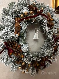 Ghirlanda natalizia di abete innevato artigianale, realizzata e assemblata a mano. Ottima per decorare porte e pareti