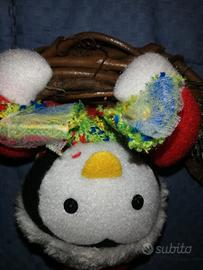 Ghirlanda natalizia intrecciata con rami . All' interno della ghirlanda si affaccia un simpatico pinguino con il suo cappellino rosso e ponpon bianco tra i rami verdi del solito abete natalizio. La ghirlanda è completata dalla scritta BUONE FESTE e da un gancetto per appendere subito la bella ghirlanda.
