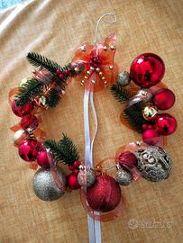 Vendo ghirlanda natalizia, formata da palline di natale e decorazioni colorate, oggetto fatto a mano, ideale come decorazione domestica, o per la porta d'ingresso o anche originale idea regalo in vista delle feste.