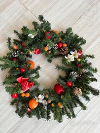 Ghirlanda di Natale realizzata con rami di sempreverde sintetici, riccamente decorata con frutta, rose di Natale, e funghetti ugualmente sintetici e pigne vere. Ha un nastro rosso per appenderla. Molto carina, come nuova.