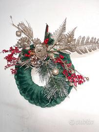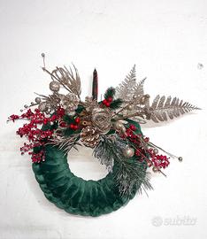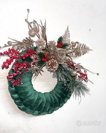 Realizzata con una base in velluto verde profondo, morbido e sofisticato, decorata con rami dorati glitterati, bacche rosse, pigne naturali e dettagli festosi che catturano la luce in modo incantevole.