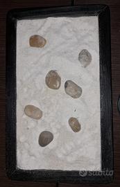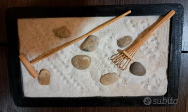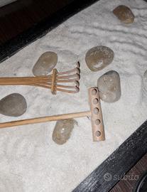 Piccolo giardino zen (18x30cm) dotato di sabbia, due rastrelli in miniatura uno in legno uno in bamboo e 8 piccole pietre. La base è in legno color wenge con piedini tondi.