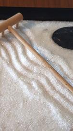 Kit composto da vassoio base, pietre vere, sabbia artificiale e rastrello in legno.