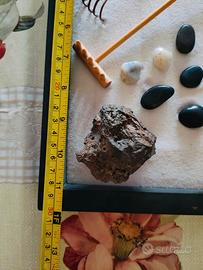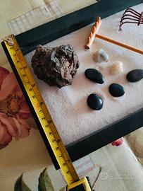 Piccolo giardino zen nero 30x8cm con sabbia bianca, 2 rastrelli, pietre e 1 roccia.