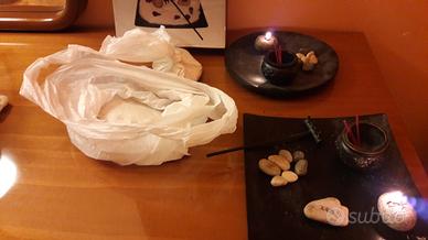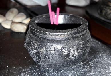 Mini giardino Zen su piatto tondo nero con sassolini, sabbia bianca, pietra candela e bruciatore per incensi a stecchetto o conici.