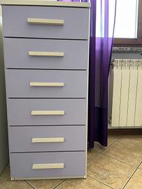 Vendo elementi cameretta Giessegi: 1 letto a castello con cassettone contenitore, 2 materassi in schiuma d'acqua, 2 piumoni Zucchi color lilla/viola double face, peso invernale, 2 paia di lenzuola complete in cotone Zucchi (lilla/righe + bianco/topolina), 1 cassettiera settimanale, 1 scaletta con cassetti. Tutto pari al nuovo.