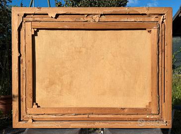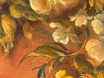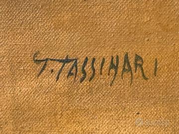GINO TASSINARI (Livorno, 1920 – 2001) Natura morta con vaso di fiori e paesaggio Olio su tela, cm 100 × 70 Firma in basso a sinistra: “G. Tassinari” Cornice originale coeva. Importante natura morta floreale di ampia dimensione, raffigurante un ricco mazzo di fiori policromi disposto entro un vaso in terracotta. La composizione, articolata e armoniosa, si distingue per la varietà botanica e per la vivacità cromatica, resa attraverso una pennellata morbida e tradizionale. Di particolare interesse è lo sfondo, nel quale si intravede un paesaggio appena accennato con architetture e ponte, elemento non sempre presente nella produzione dell’artista e che arricchisce la profondità spaziale dell’opera. Note storico-artistiche Gino Tassinari appartiene alla scuola pittorica livornese del secondo Novecento, legata alla tradizione figurativa post-macchiaiola. La sua produzione, fedele alla pittura dal vero, si concentra prevalentemente su paesaggi, vedute urbane e nature morte. Le composizioni floreali rappresentano una parte significativa della sua attività e sono apprezzate per il loro carattere decorativo e per la continuità con la tradizione pittorica toscana. Stato di conservazione Buono stato generale. Si segnala una leggera ossidazione della vernice superficiale e minimi segni del tempo. Provenienza Collezione privata, Italia. Acquistato a metà degli anni Cinquanta e rimasto continuativamente nella collezione dell’acquirente. Opera di qualità medio-buona, superiore alla media della produzione corrente sul mercato, valorizzata dal formato importante e dalla composizione particolarmente ricca. Valutazione: 750 €