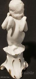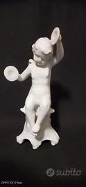 Coppia di Statuine Ginori - Puttino suonatore con cimbali H 14cm e Puttino con Flauto di pan H 13 cm ,i soggetti siedono su una alzatina, quella del flauto ha rifiniture in oro .La serie dei puttini musicanti è composta da 4 soggetti, ogni angioletto ha uno strumento diverso: i cimbali, il flauto traverso, il flauto di Pan e i cornetti. Originariamente facevano parte di un più complesso trionfo da tavola composto alternativamente da giardiniere e statuette, ma le figure potevano essere vendute anche separatamente e in composizioni diverse.