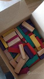 Vendo set di mattoncini in legno colorati, in varie forme rettangolari e in diversi colori vivaci (rosso, verde, giallo, viola, naturale). Ideali per costruzioni, giochi creativi o attività educative per bambini.