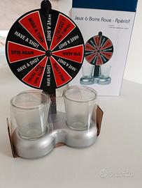 2 set giochi per divertirsi in compagnia, uno shot spinner e una ruota per bere con relativi bicchieri