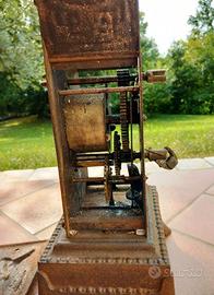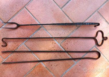 Antico girarrosto in ghisa da camino da restaurare, vintage fine ‘800, azionamento manuale, manca la manovella, compreso di utensili in ferro battuto per prendere e per spostare i ceppi e per infilzare la carne. Dimensioni: altezza 34 cm, base 22 x 18 cm