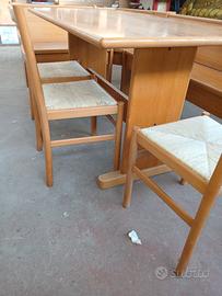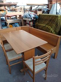 giro panca in rovere tinta. quasi naturale. possibilità angolo a dx e a sx. due cassetti sotto sentare . più tavolo cm 140 per 80 con tre sedie. vendita per visione